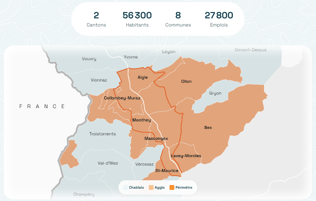 Depuis 2008, huit communes (Aigle, Bex, Collombey-Muraz, Massongex, Ollon et Monthey, Lavey-Morcles et St-Maurice), une région (le Chablais) et deux cantons (Valais, Vaud) ont signé une Charte d’intention affirmant leur volonté de créer « une agglomération multipolaire, fortement interconnectée, à haute qualité du cadre de vie et des activités économiques ». Depuis, ces 8 communes collaborent au développement d’une vision commune et à la concrétisation de projets favorisant un développement harmonieux de ce territoire.