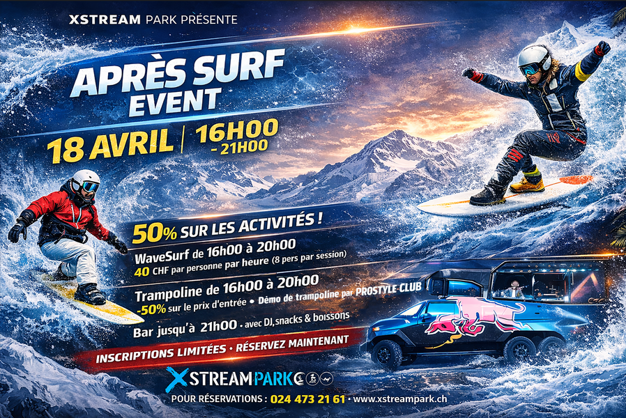 L’activité WaveSurf est accessible à partir de 8 ans, et les inscriptions sont ouvertes à tous les niveaux. Bénéficiez d’une réduction de 50 % sur les tarifs d'entrée pour le WaveSurf et les trampolines jusqu'à 20h00. Le bar sera ouvert jusqu’à 21h00 avec DJ RedBull, ainsi que des snacks et boissons à votre disposition. Une démonstration de trampoline sera effectuée par "Prostyle Club". Les places étant limitées, les inscriptions se font uniquement par téléphone ou par courriel. Que ce soit pour sauter, pratiquer le WaveSurf, ou simplement pour venir boire un verre dans une ambiance festive et tropicale, n’hésitez pas à venir découvrir notre événement !